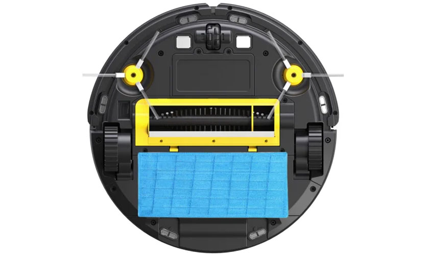 Le panneau inférieur. Il contient une paire de roues motrices et un rouleau pivotant, qui sont responsables du mouvement de l'aspirateur. Pour se protéger des chutes d'escaliers ou des seuils élevés, des capteurs de reconnaissance des différences de hauteur sont installés en bas.