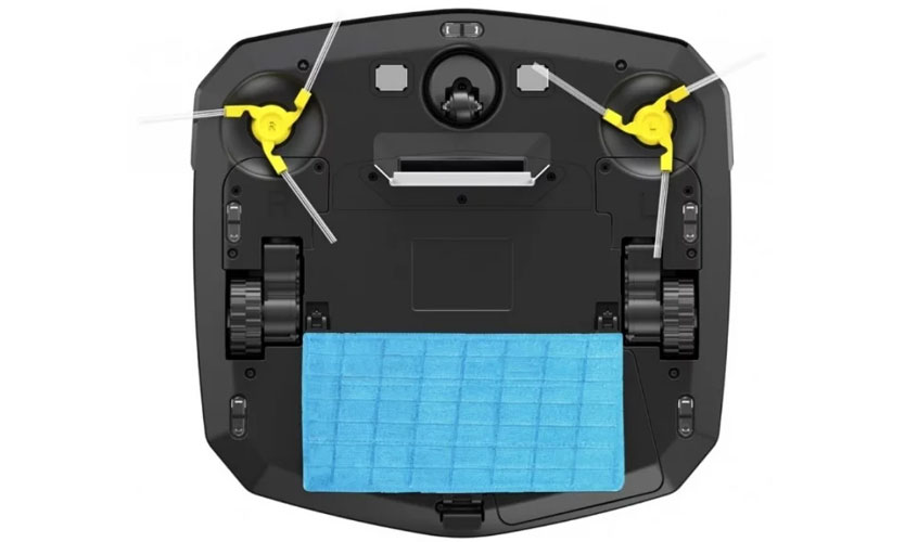 Au bas du robot, il y a deux roues motrices et une avant pour les manœuvres. Il y a aussi deux brosses latérales, un module d'aspiration au centre, un compartiment batterie, des capteurs de différence de hauteur qui protègent le robot contre les chutes et les renversements. Une buse spéciale est installée sur le fond pour que le robot fonctionne comme polisseur de sol.