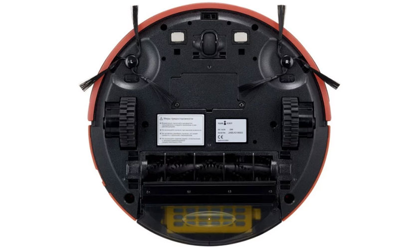 En regardant en bas, vous pouvez trouver une paire de brosses latérales souples avec trois faisceaux, entre eux se trouve un rouleau pivotant pour manœuvrer, qui tourne facilement et librement, fournissant des tours du robot. Sur le côté du bas, il y a des contacts pour charger sur la station d'accueil. Sur les côtés, les roues motrices principales sont situées de manière à ce que l'aspirateur puisse tourner autour de son propre axe. Pneus à bande de roulement avec un motif spécial pour une portance élevée sur les tapis à poils.