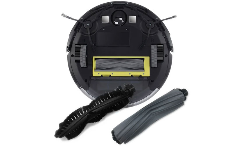 En bas, il y a une paire de grandes roues motrices, montées sur une suspension puissante, avec laquelle l'aspirateur passe facilement de petites collines, un rouleau avant, deux brosses latérales et une centrale avec des attaches. Voici les contacts pour l'installation sur la station de charge, le couvercle du compartiment batterie, les capteurs de différence de hauteur.