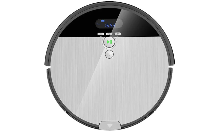 Au-dessus des boutons se trouve un écran à cristaux liquides inversé, rétroéclairé en blanc. Affiche toutes les indications de test lorsqu'il est allumé. En cas de forte lumière, l'indication s'estompe et est difficile à distinguer, c'est pourquoi le fabricant a ajouté une bande son à l'état du robot aspirateur.