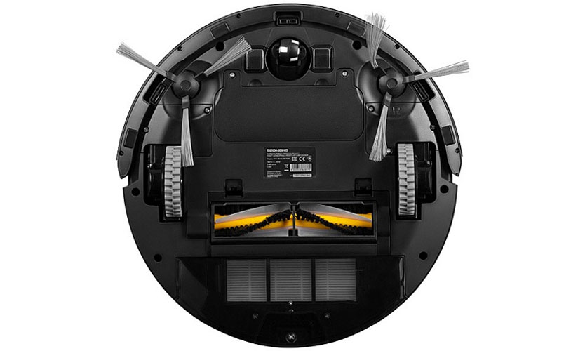 Sur la surface supérieure de l'aspirateur, il y a un panneau mobile avec un écran et trois boutons de commande. Un appareil démarre, appuyez sur le deuxième pour l'envoyer à la base et le troisième agit comme un planificateur de nettoyage. Le côté du robot est équipé d'un pare-chocs souple. Il y a aussi un bouton marche / arrêt, un emplacement pour connecter un adaptateur secteur externe et un dépoussiéreur rétractable qui peut être remplacé par un récipient d'eau. Des capteurs de détection d'obstacles sont situés le long du périmètre de l'appareil. Au bas de l'appareil se trouvent: