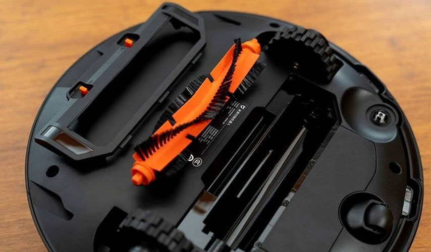 Sur la surface inférieure se trouve la brosse rotative principale en noir et orange, deux grandes roues, des plaques de chargement sur la station d'accueil, un compartiment à piles et une brosse pour changer de direction (il y en a aussi une supplémentaire pour collecter les débris, la poussière).
