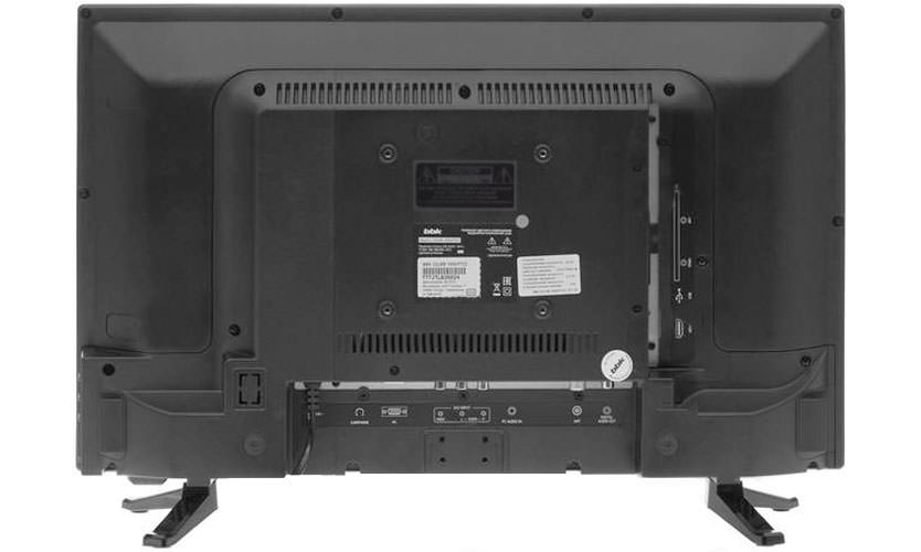 Le corps est en plastique noir ordinaire. Dimensions - 510 × 340 × 165 mm. Il y a un support pour l'installation sur une table ou une bordure, vous pouvez l'accrocher au mur, mais un support supplémentaire avec des dimensions de montage de 100 × 100 mm est nécessaire. Poids du téléviseur - 2,3 kg.