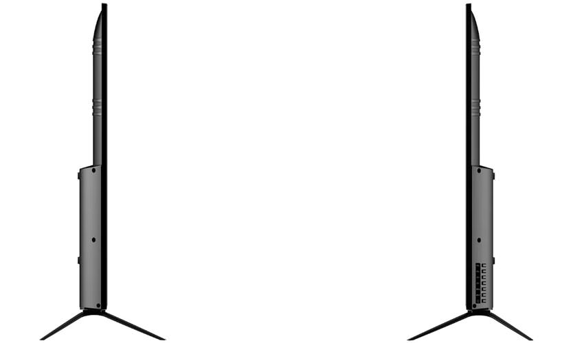 Le boîtier TV est en plastique noir, de bonne qualité: il ne grince pas, ne clique pas, ne fait aucun bruit. Dimensions - 1462 x 901 x 279 mm sans support. Poids - 25 kg. Les pieds du téléviseur sont largement éloignés les uns des autres, tous les supports ne conviendront pas. L'ensemble est livré avec un support mural VESA 400 × 200 mm. Mais en suspension, l'écart entre l'écran et le mur est trop petit: il est difficile d'atteindre les connecteurs situés à l'arrière. Un écran fragile nécessite une manipulation minutieuse.