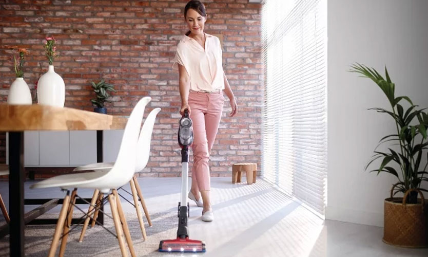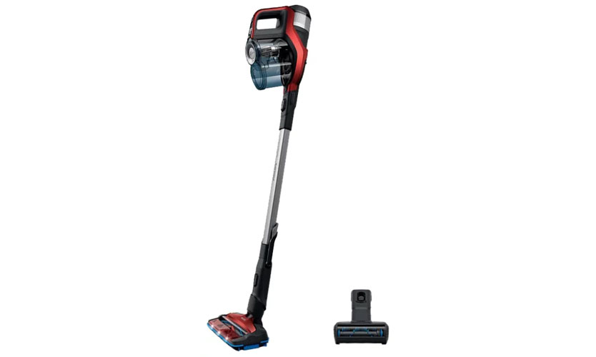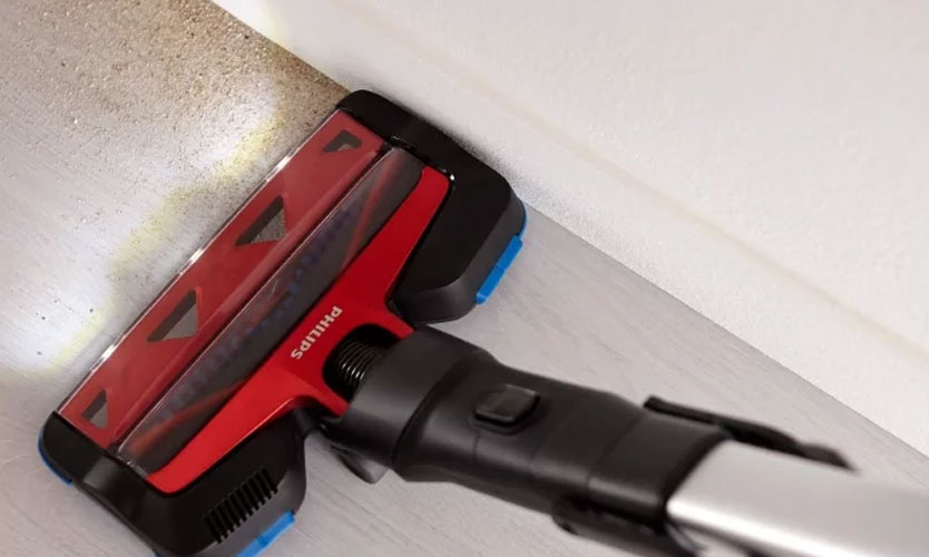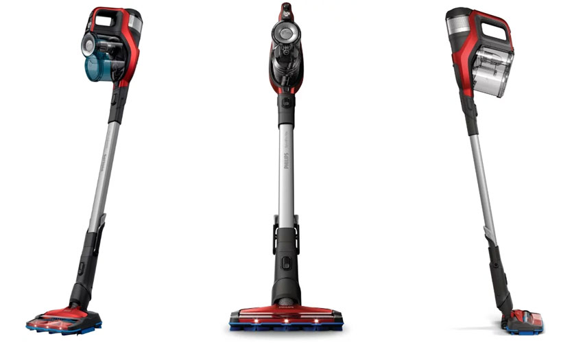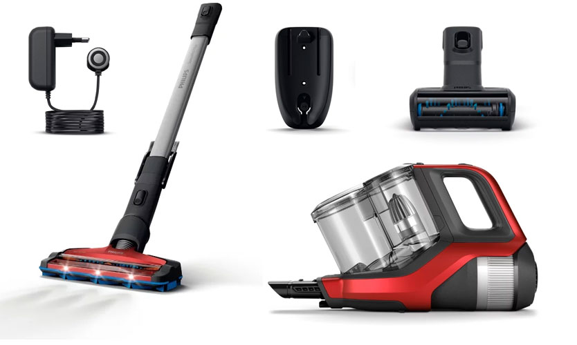 Aspirateur Philips FC6823 SpeedPro Max de type vertical, premium. Le modèle est équipé d'une buse spéciale avec une fonction d'aspiration à 3600. Lors du déplacement, toutes les particules de poussière et les débris sont aspirés le long des bords, avec un mouvement de retour. Le nettoyage est 30% plus efficace que les accessoires conventionnels, ce qui permet de gagner du temps. L'aspirateur sans fil devient plus mobile dans les endroits isolés et étroits, le rayon de travail n'est pas limité par un fil. La batterie puissante fournira un fonctionnement continu pendant 65 minutes.